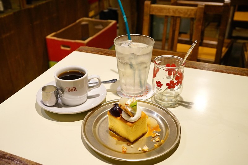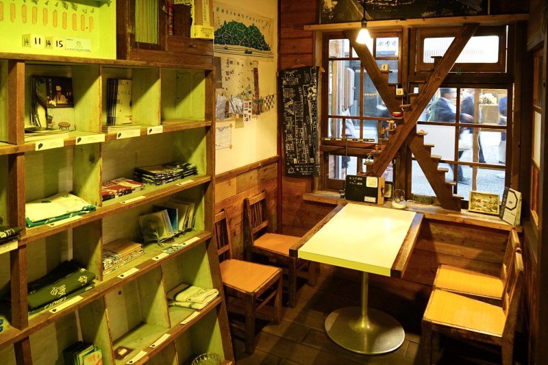 這個複合空間可略分為三個部分,面向商店街的是「哈欠咖啡館」(あくびカフェー),活用各地拆除不用的老屋裡的建材,將閒置已久的舊眼鏡行,以木格置物層架、教學器材道具、黑板菜單等,改造成以小學教室為主題風格的可愛咖啡店。