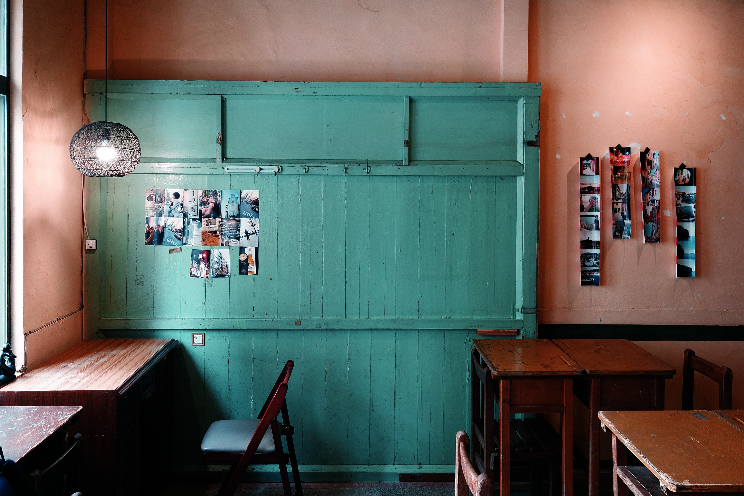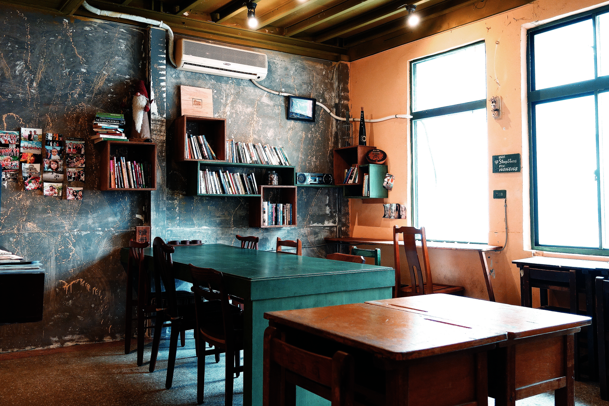 樓梯頂端連接到老房子的二樓,一座幾乎未經改裝過的空間,店主為了呈現老屋原本的模樣,選擇不將隔間牆拆除擴大使用範圍,反而保留原本的房間作為包廂,而包廂外的座位區則是妥善的運用加法,擺上小學課桌椅與床板釘成的長桌,書架上放著世界各國的旅遊書籍與店主在各國旅行的照片,說明了店主一定是個開朗的人。果然沒猜錯,店主看到我們提著相機躍躍欲試的樣子,在還未提出拍照的請求前,便很熱情的歡迎我們在裡頭自由走動拍攝。