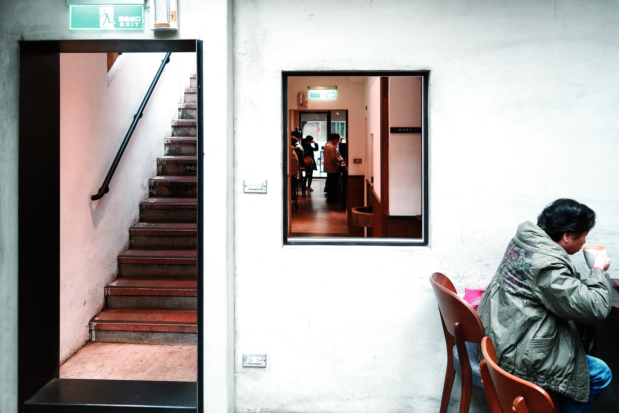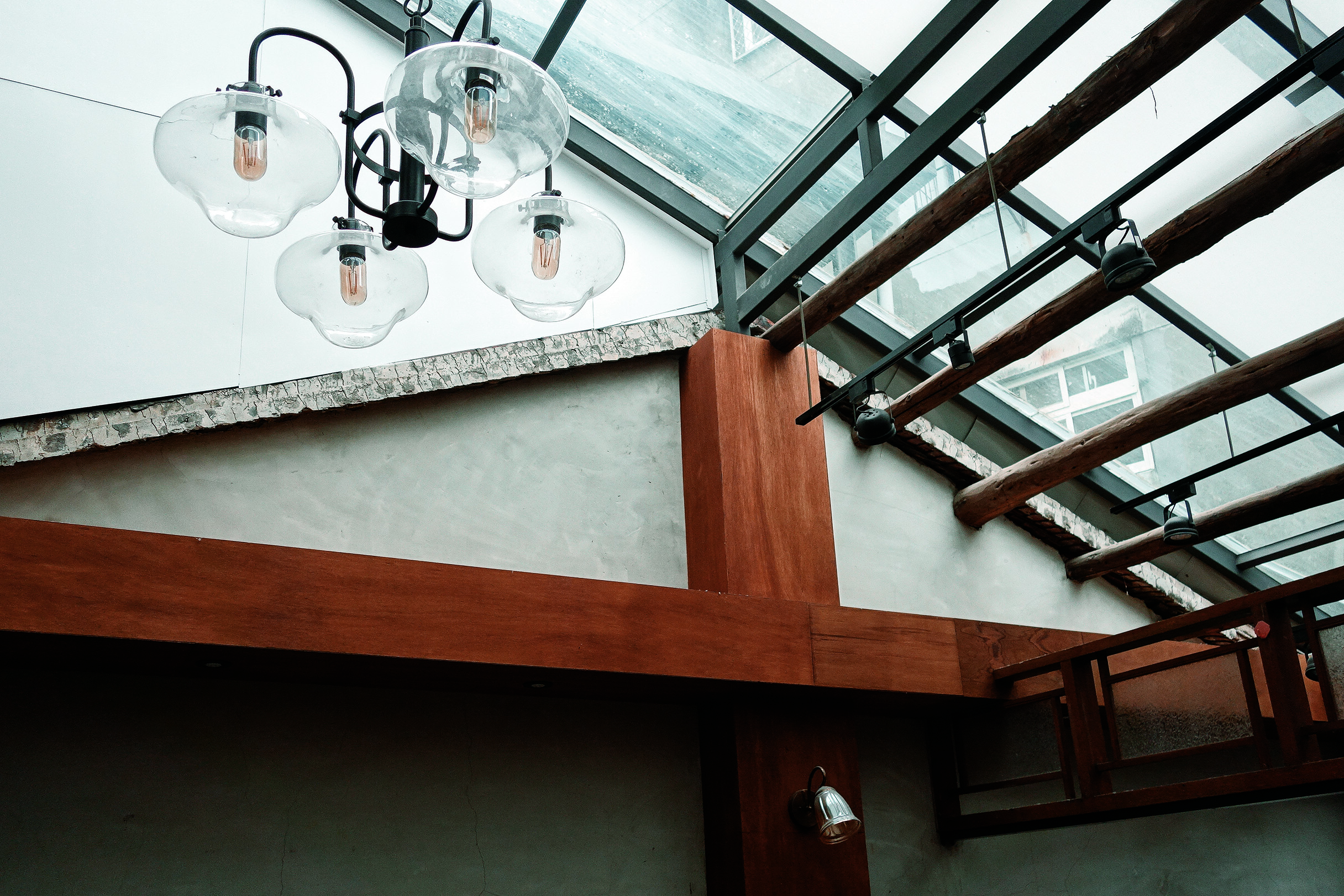 扶著厚潤質感的磨石子扶手,踩上磨石踏階上到二樓小陽台,此為老厝前後段分際,在這裡可俯瞰一樓用餐區,也能更清楚的看到後棟玻璃帷幕屋頂的改建構造。若喜歡溫暖昏黃的環境,則可在一旁的室內用餐區享用咖啡,於此店家保留了屋頂的屋瓦與橫梁、紅磚牆面與地板,是店裡保留了最多的老屋原貌的空間,充滿復古氛圍。