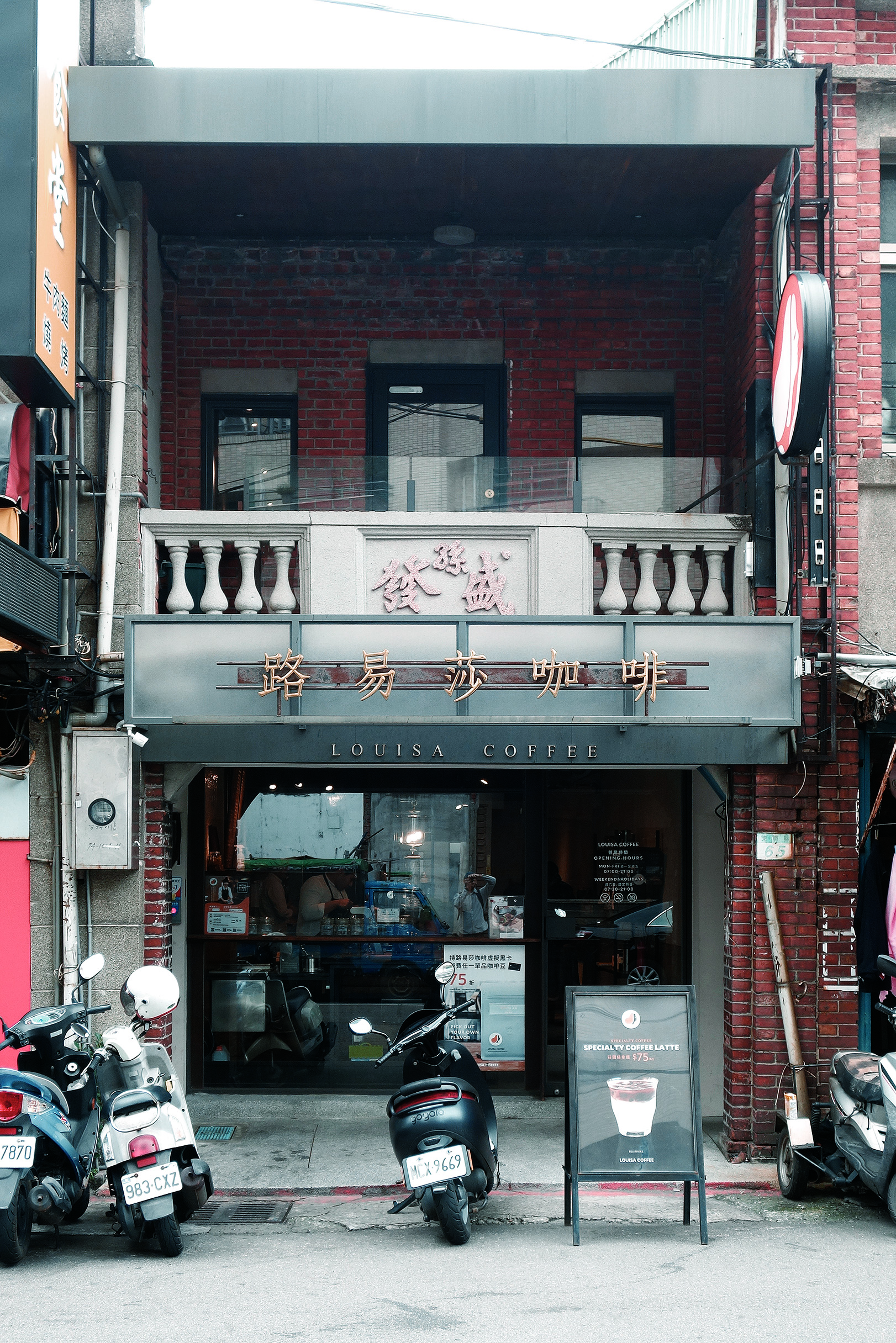 光明路上有一些日治大正年間整建的洋樓,部分甚至留下了華麗的山牆,可惜許多間立面隨持有人易主已經改建,或被商家招牌燈箱所覆蓋,暫時難以一窺洋樓完整面貌。這間路易莎咖啡進駐在原本的「孫盛發」商號,這座近百年的古厝於1960年代曾作為皮鞋店,後續也改賣童玩、飲料雜貨,但建築立面大致完好,咖啡店進駐後盡可能保留並展現老屋原貌,成為這些新進駐店家中的特殊案例,也是該品牌第一間運用古厝經營的門市。
